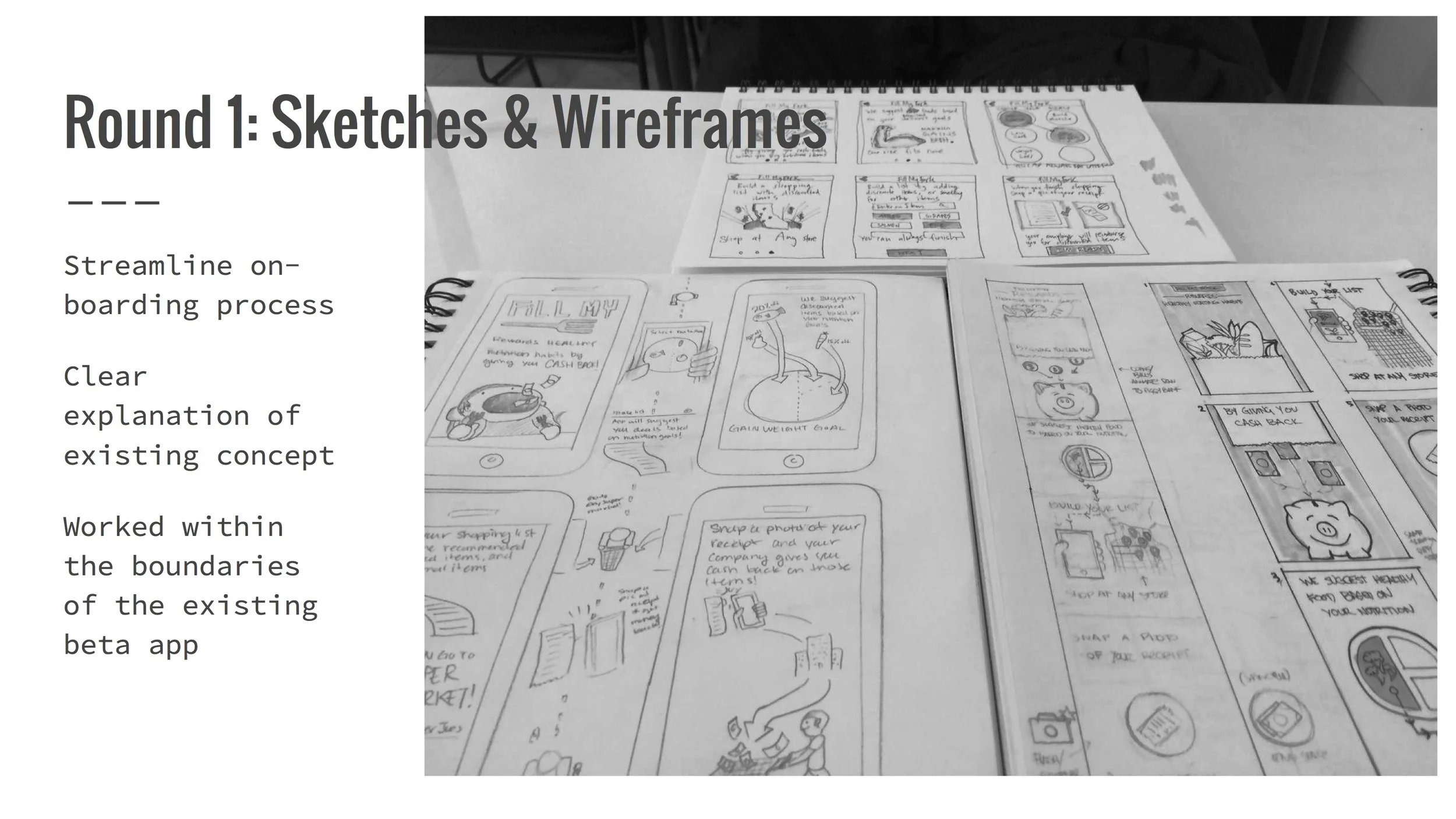 Iteration 1 focused on improving the on-boarding process by clarifying the concept. Using the beta app on-boarding as a template, my team worked on sketching wireframes with illustration and copy that conveys the app's value.