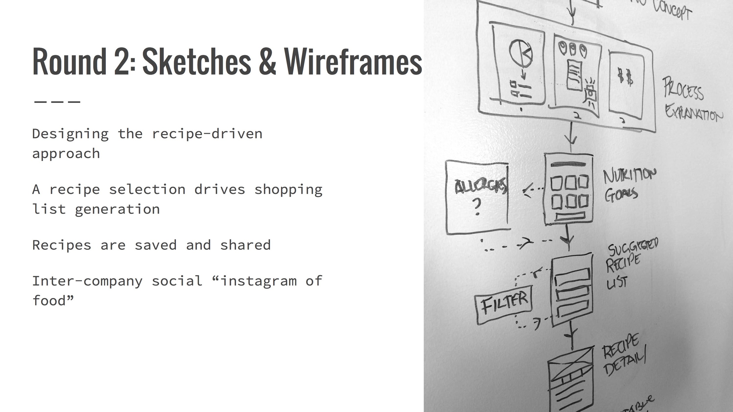 This mini-wireframe "user flow" shows how recipe suggestions based on dietary preferences and cooking skill level would populate the user's shopping list.